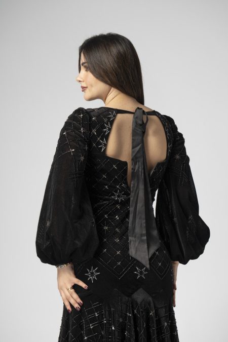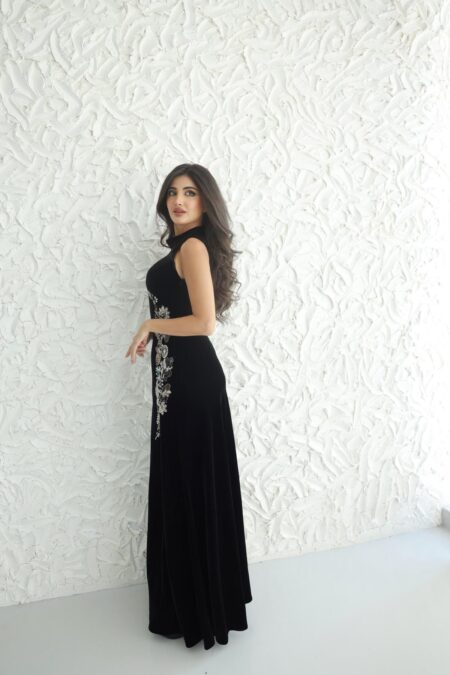 فستان نسائي اسود طويل بساق مفتوحة و زينة عندك الكتف