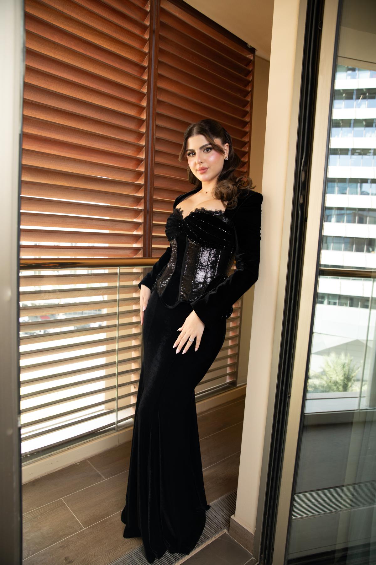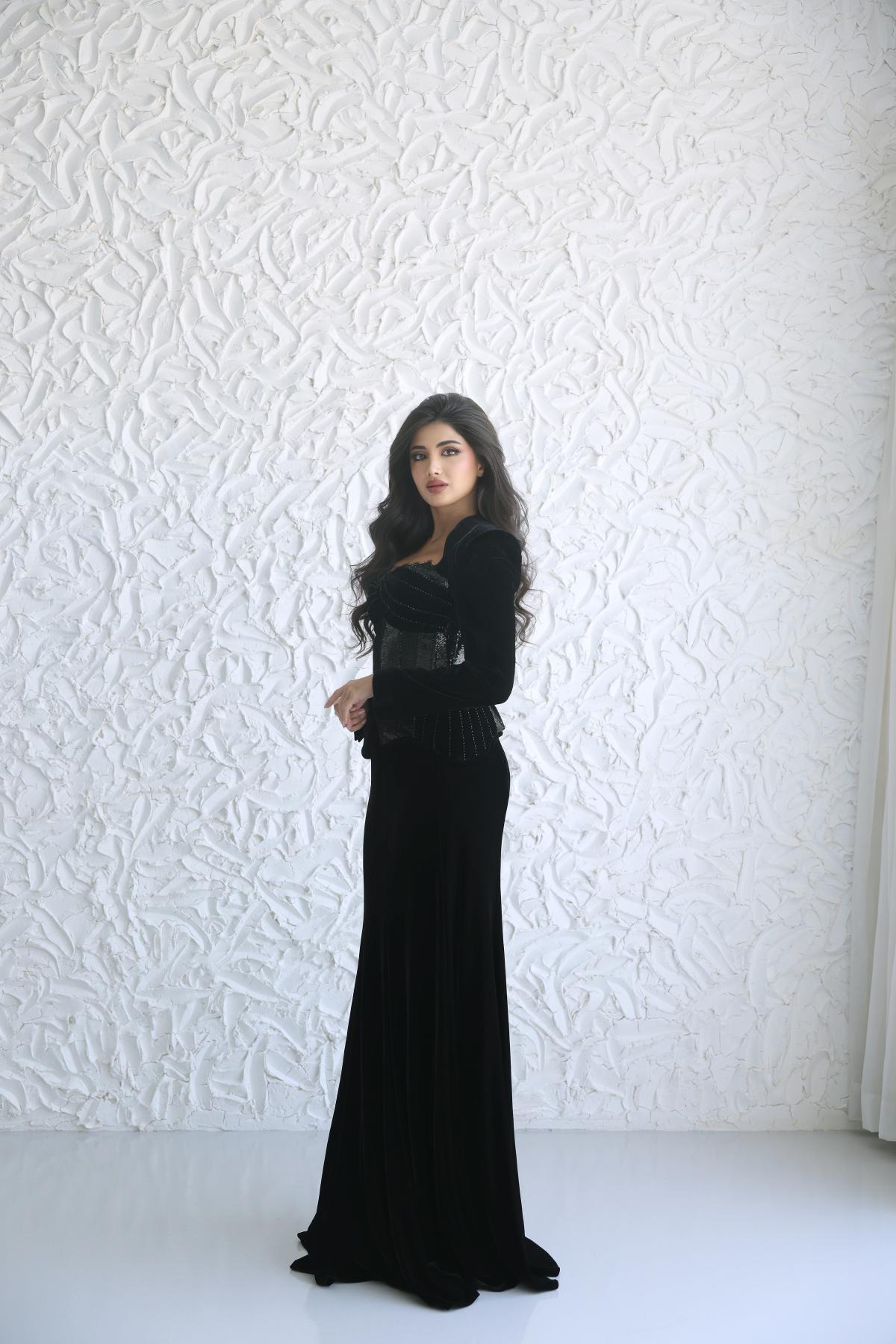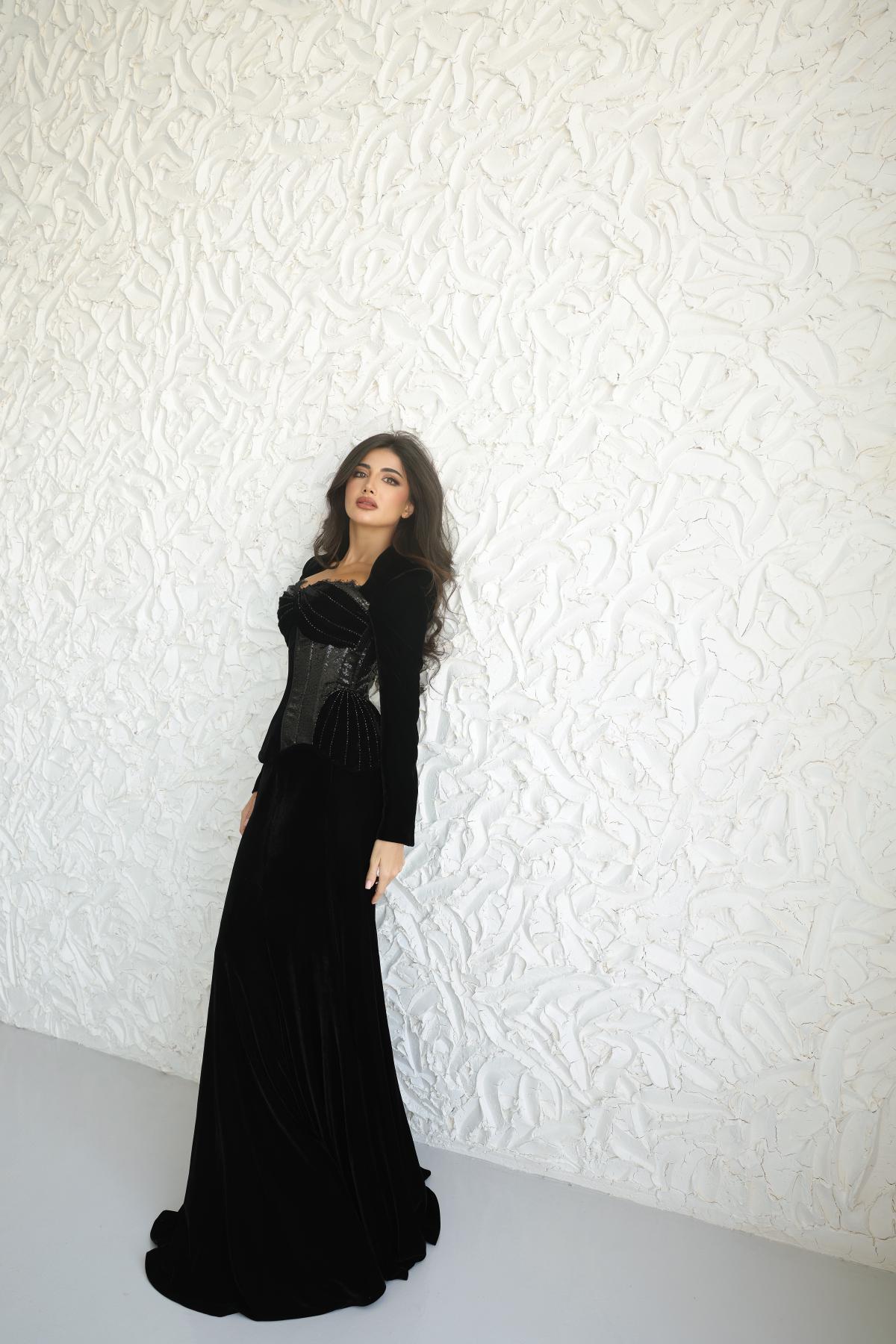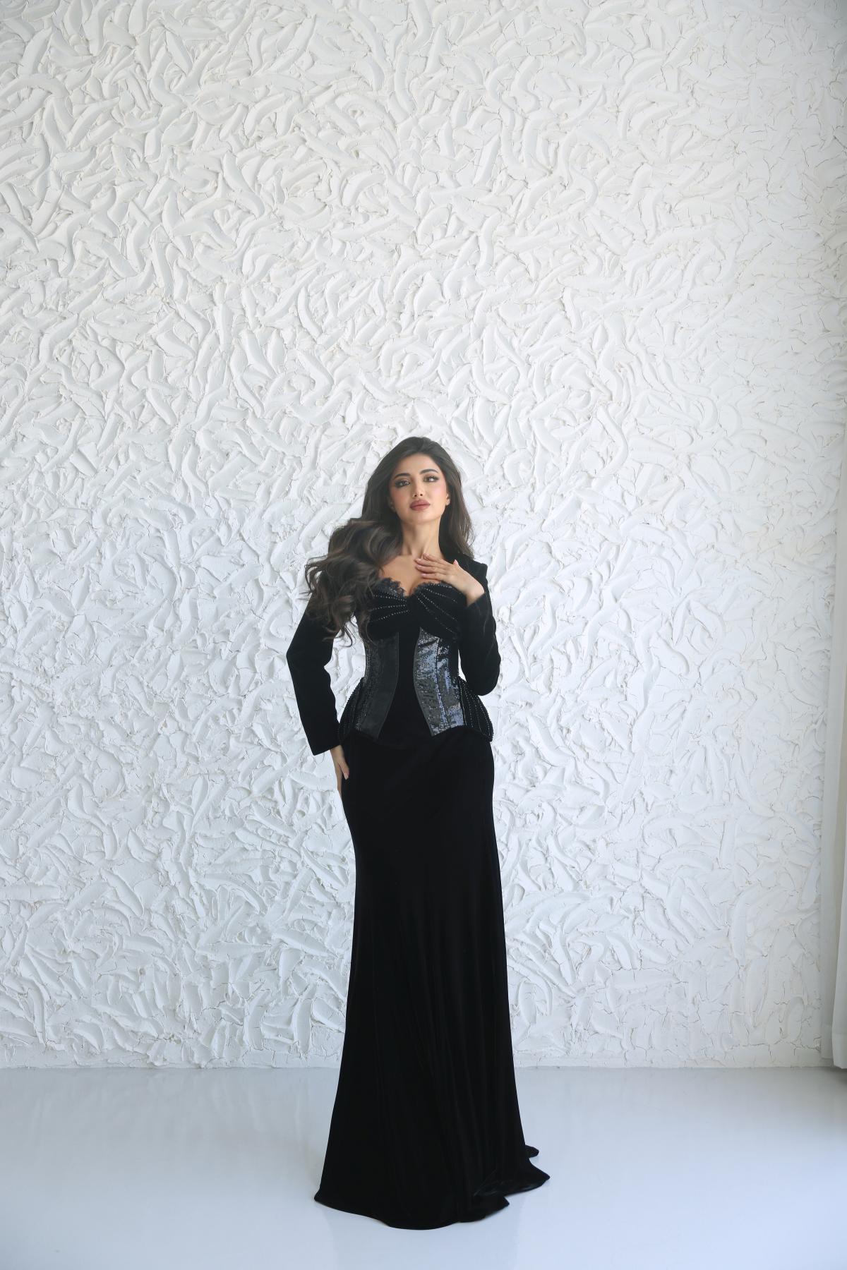يتميز بقماش مخملي فاخر ينسدل بانسيابية على القوام، مع كورسيه لامع مطرّز بلمسات دقيقة تضفي بعدًا نحتيًا وأناقة آسرة.