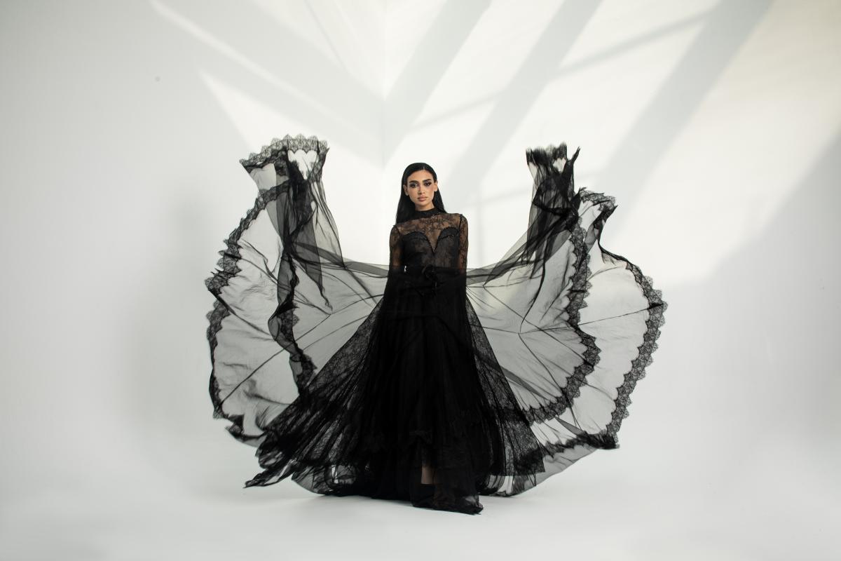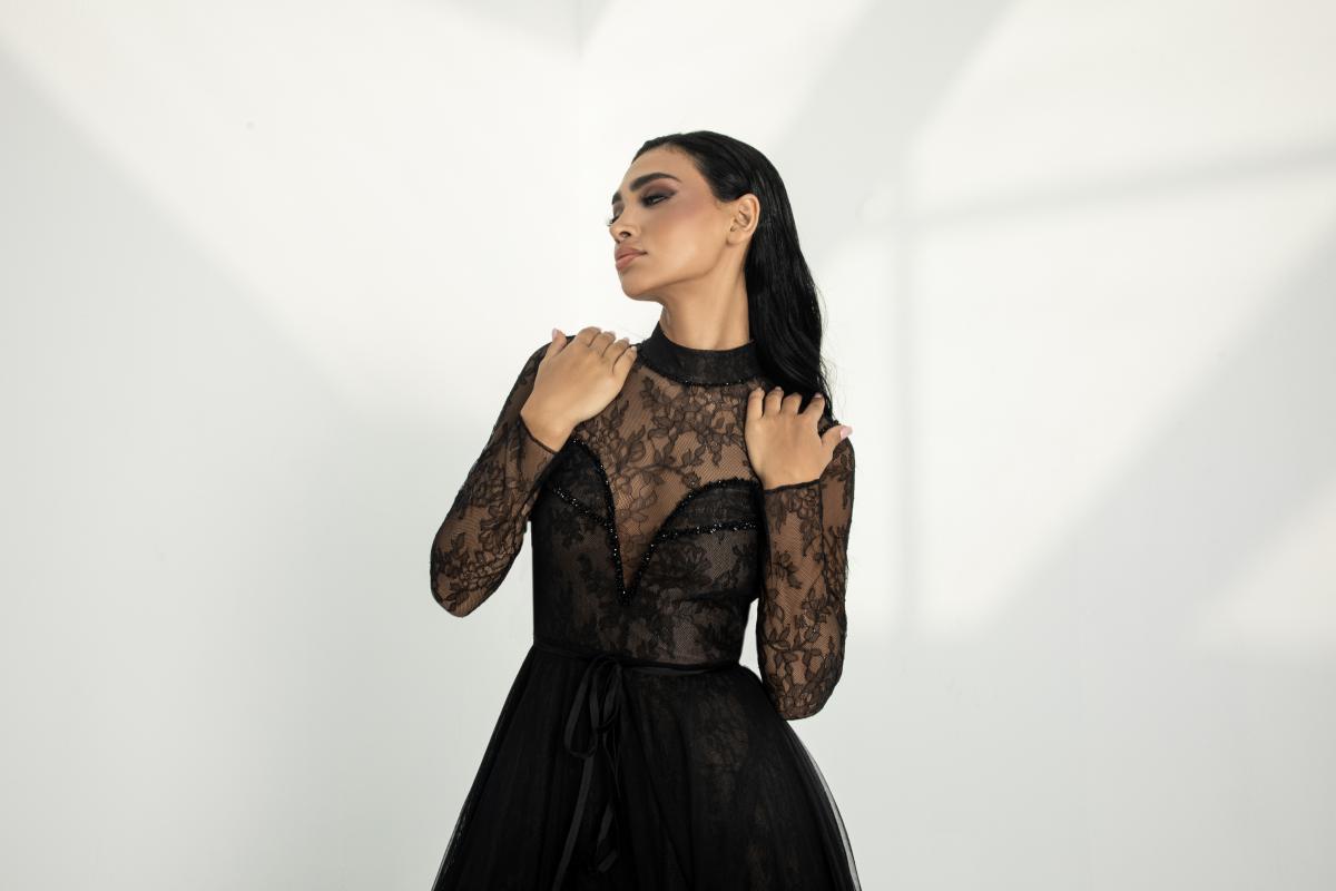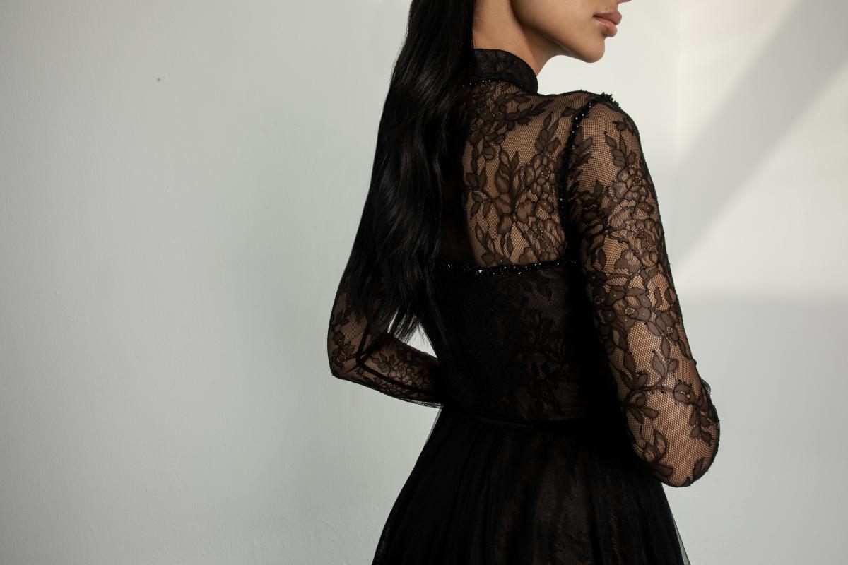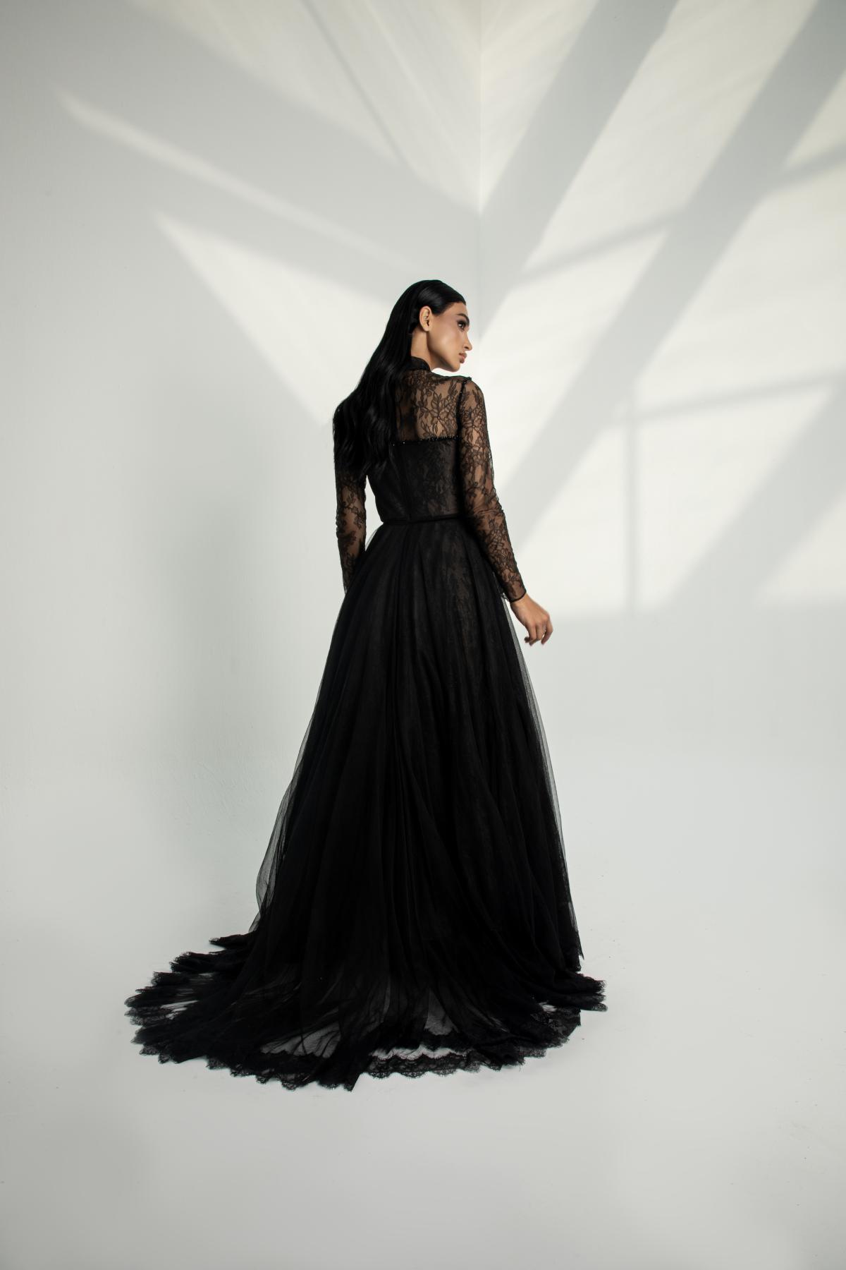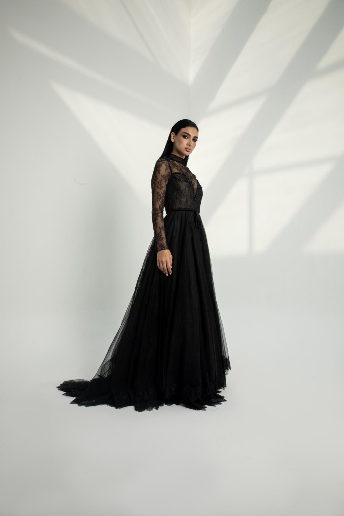 فستان سهرة أسود بدانتيل وتول فاخر