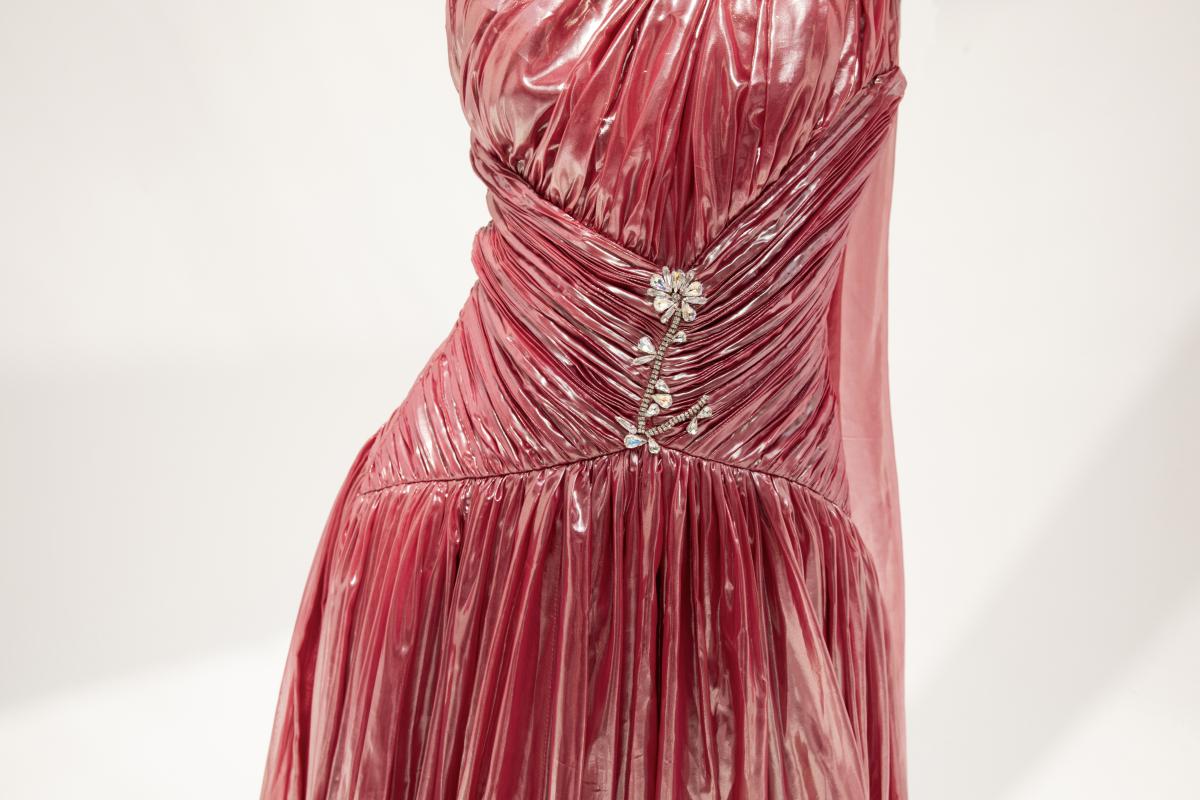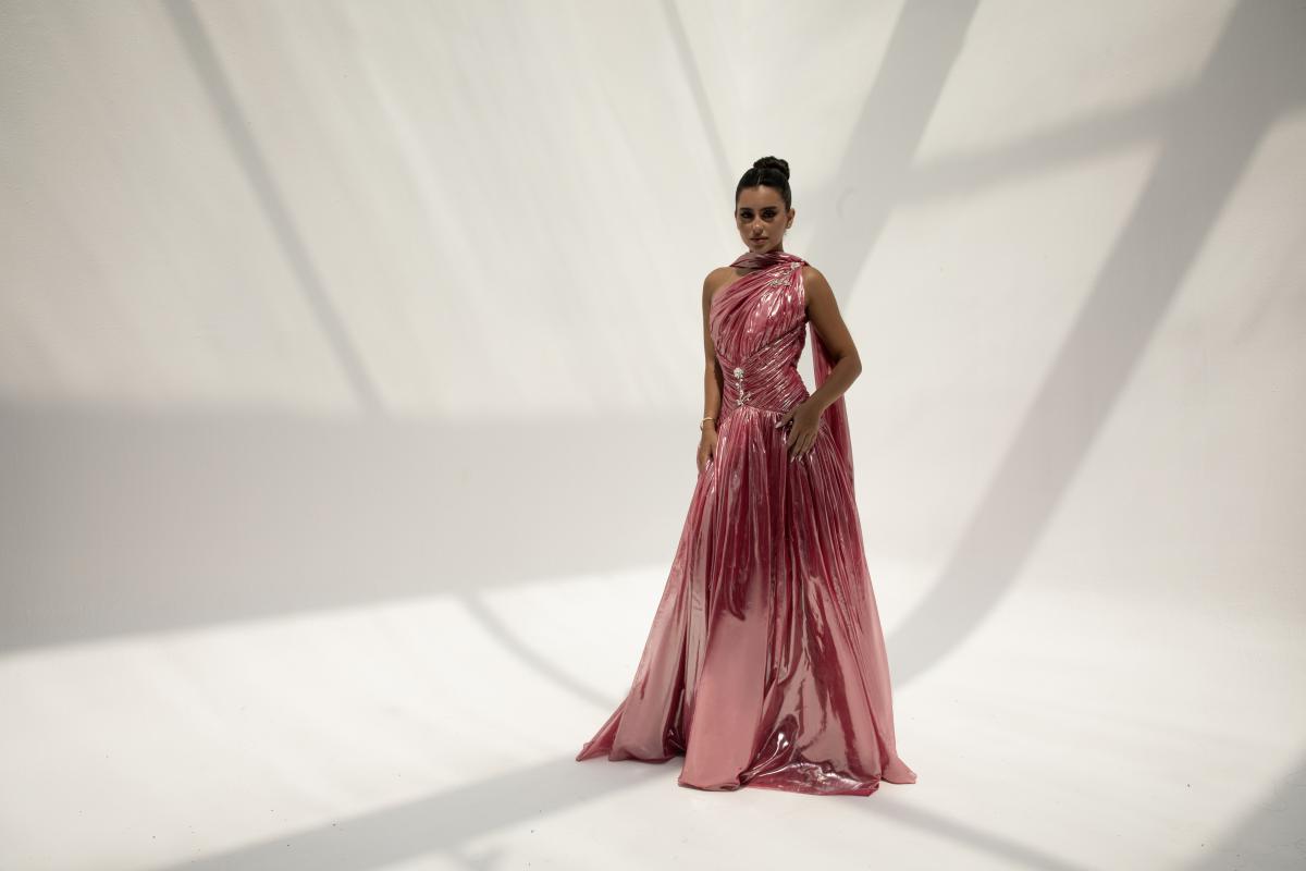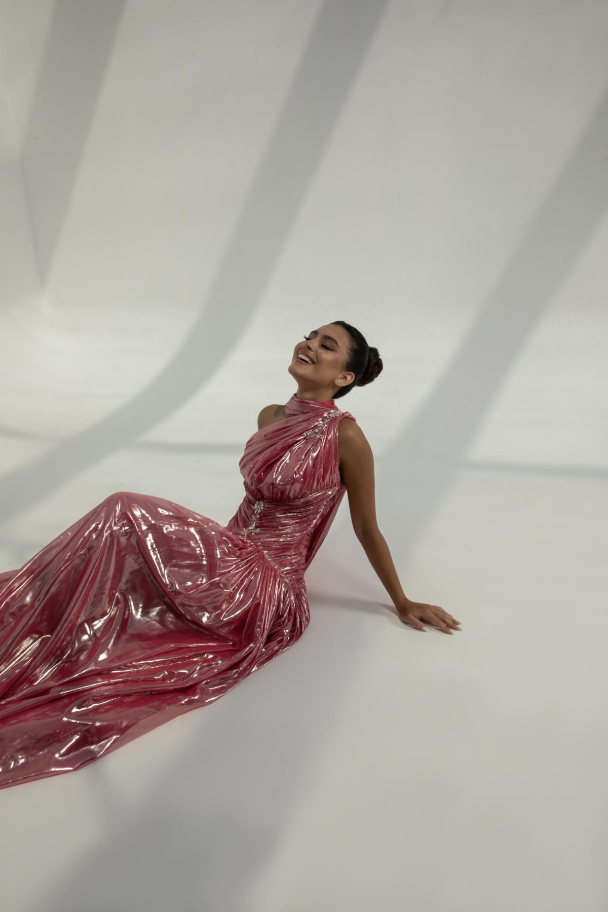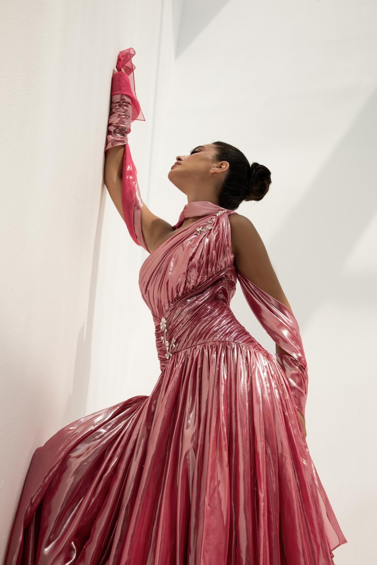 فستان سهرة بلون وردي داكن، مصنوع من قماش اللاميه لامع . يتميز بتصميم بكتف واحد، خصر محدد، وتنورة طويلة بكسرات تضيف حركة أنثوية ساحرة.