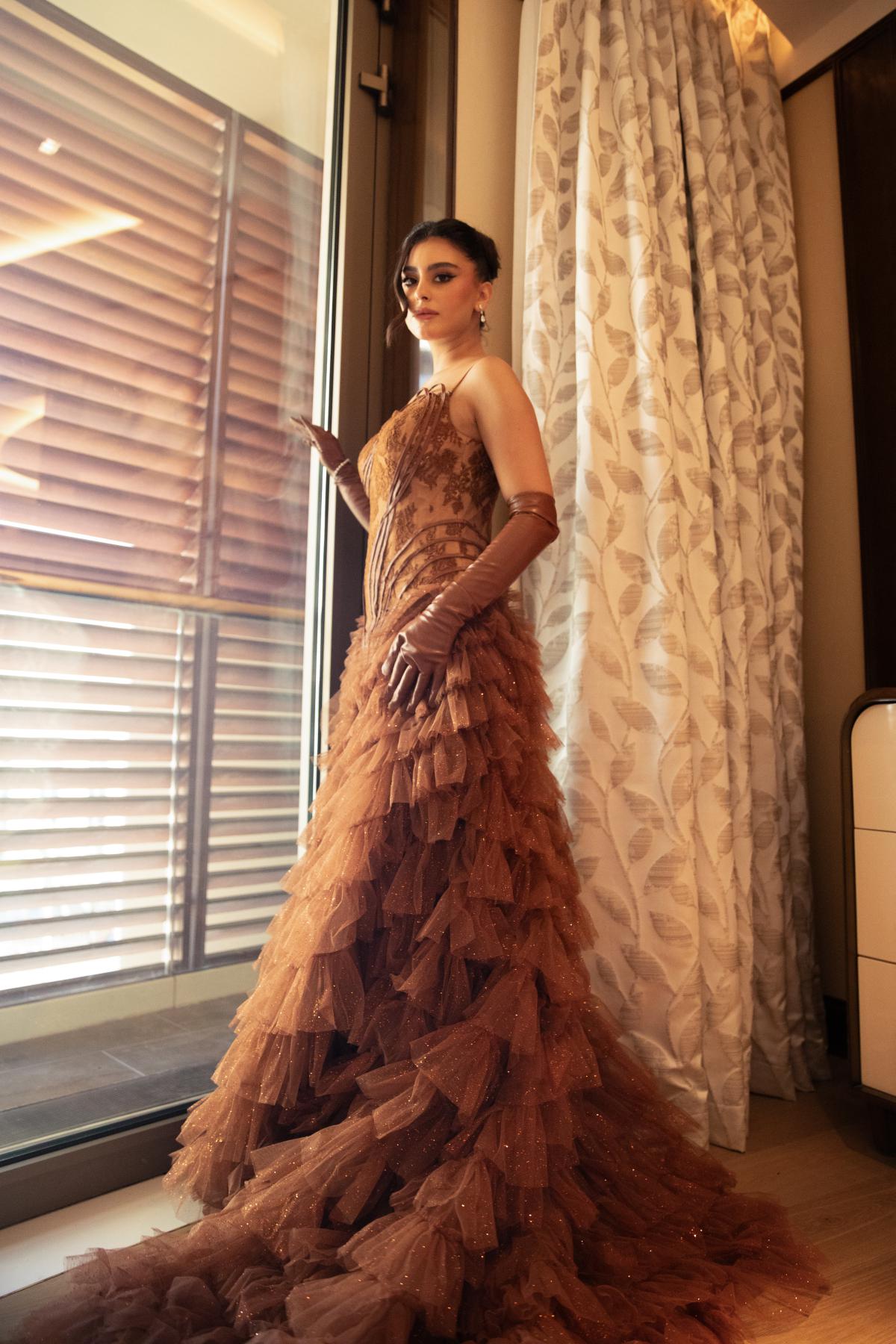 تنسدل منه تنّورة غنية بطبقات من التول البراق بحركة انسيابية فخمة، فيما تكمل القفازات الجلدية الطويلة الإطلالة بلمسة راقية