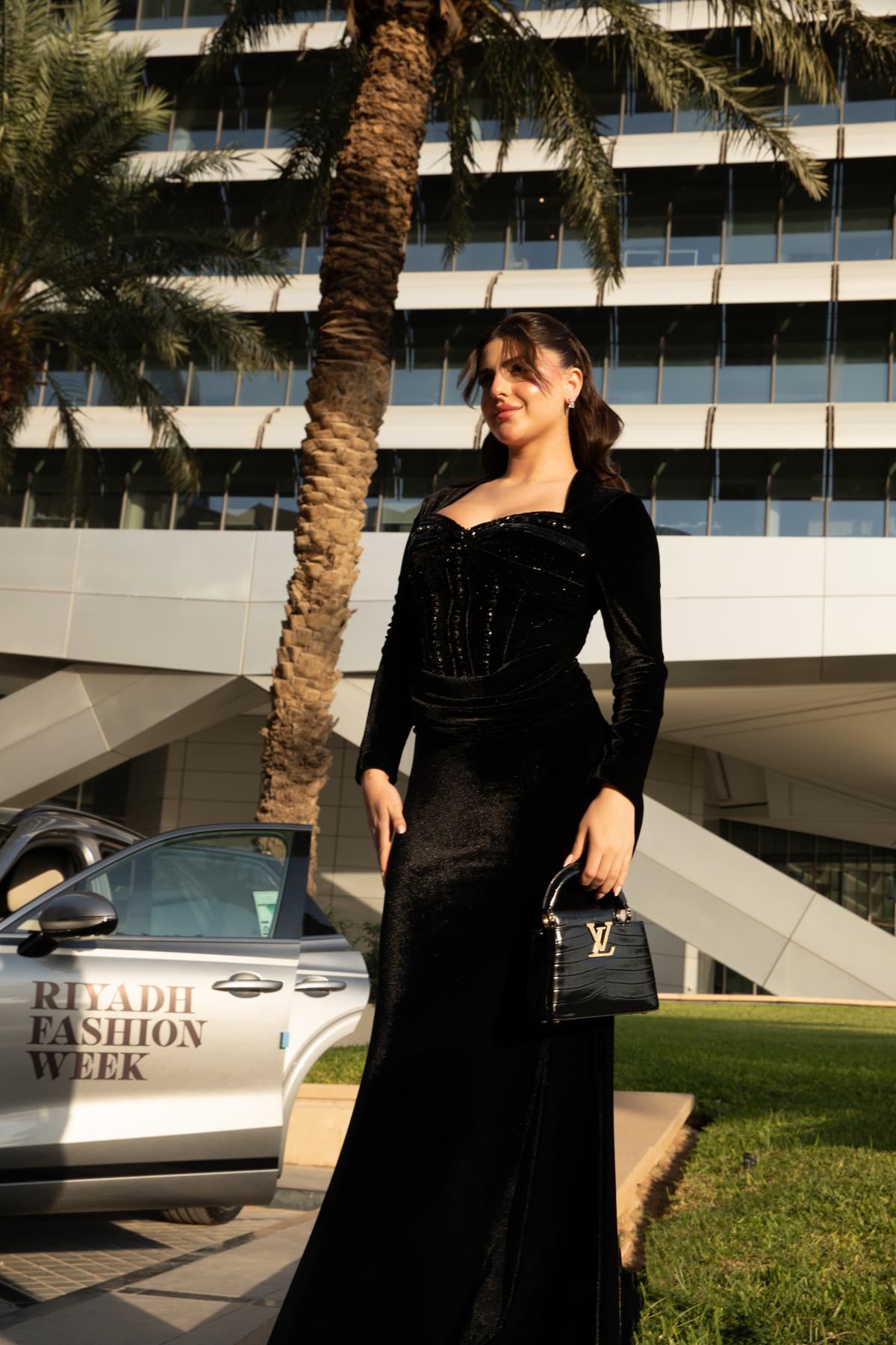 • فستان سهرة مخملي أسود بتصميم كورسيه أنثوي مطرّز يدويًا بالكريستالات والترتر الأسود