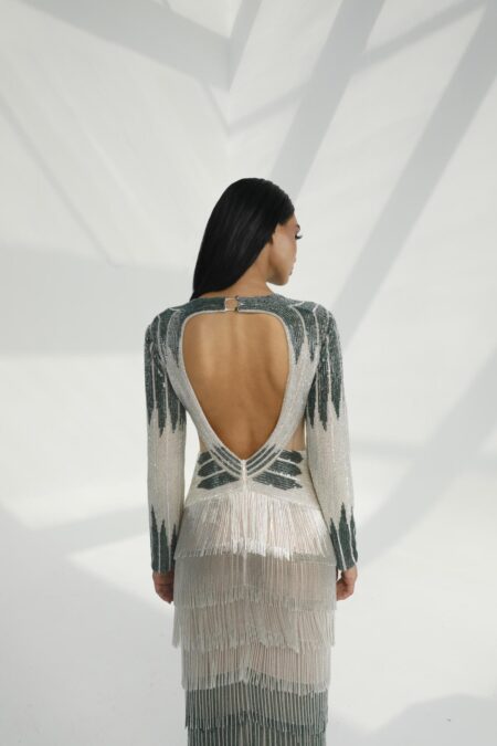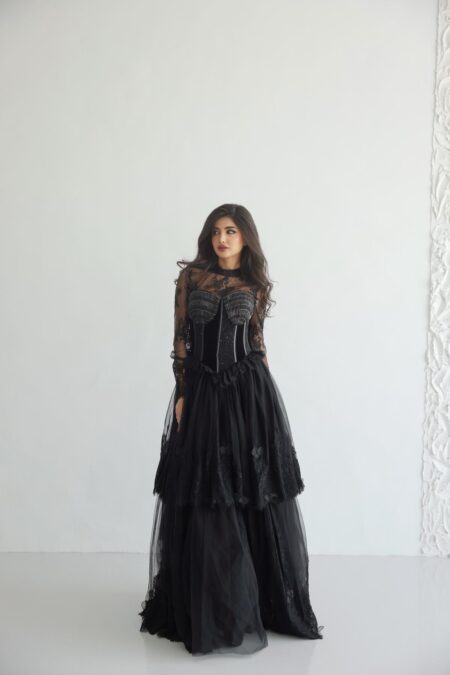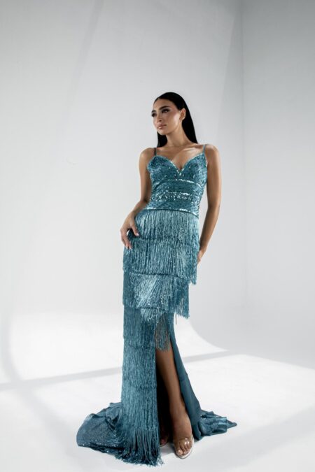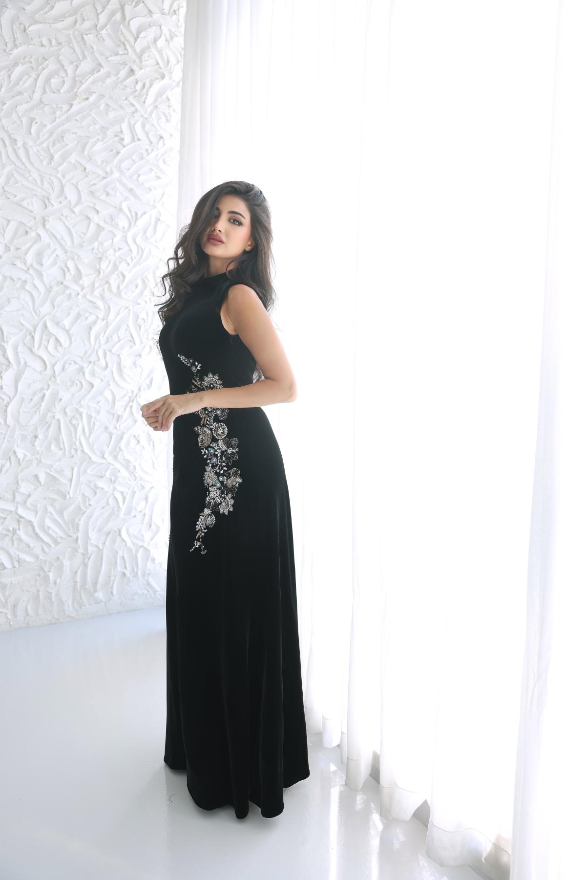 فستان سهرة مخملي أسود بتفاصيل تطريز فاخرة على الجانبين، مصمم بقَصّة انسيابية تبرز القوام برقي. يجمع بين بساطة المخمل وثراء التطريز ليمنح إطلالة كلاسيكية وأنيقة للمناسبات المسائية